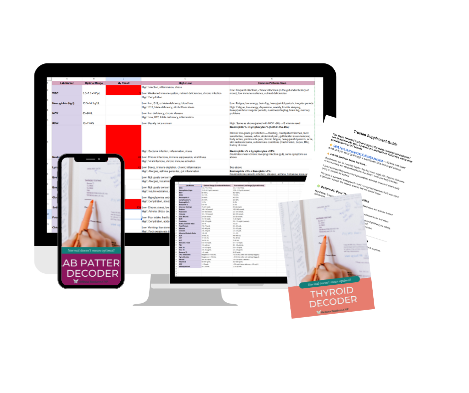 🧩 Lab Pattern Decoder – Helps identify deeper root causes behind symptoms using 8 common lab patterns seen in women with fatigue, bloating, stubborn weight, hormone and gut symptoms, and more- Plus targeted next steps, nutrition, lifestyle, and supplement suggestions!